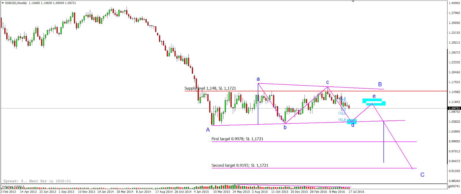 Probabil iulie-august 1,06, corecție până în 1,11 și cădere pe final de an și tot... 2017. Dacă acest scenariu devine realitate atunci căderea din 2014 reprezintă un val A, range-ul din 2015-2016, val B, și ar urma o rachetă... albă până în 0,8 (posibil USDX 120).
